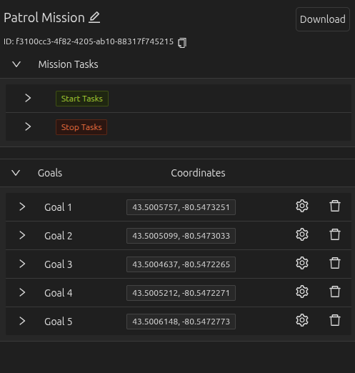 Enable the "Goalpoint Panel" toggle to open the list of available Goalpoints within the selected Mission as shown in the figure above. The Operator can now rearrange the list, add Tasks to the Goalpoints, and modify the final heading and/or tolerance of each Goalpoint. The Operator can also modify mission properties such as the mission name, and apply Tasks to when the Mission starts and stops.